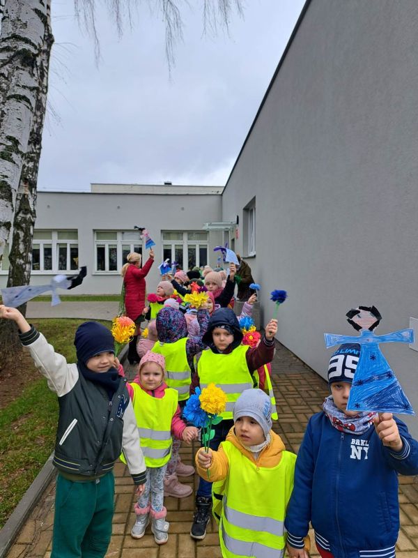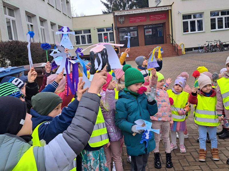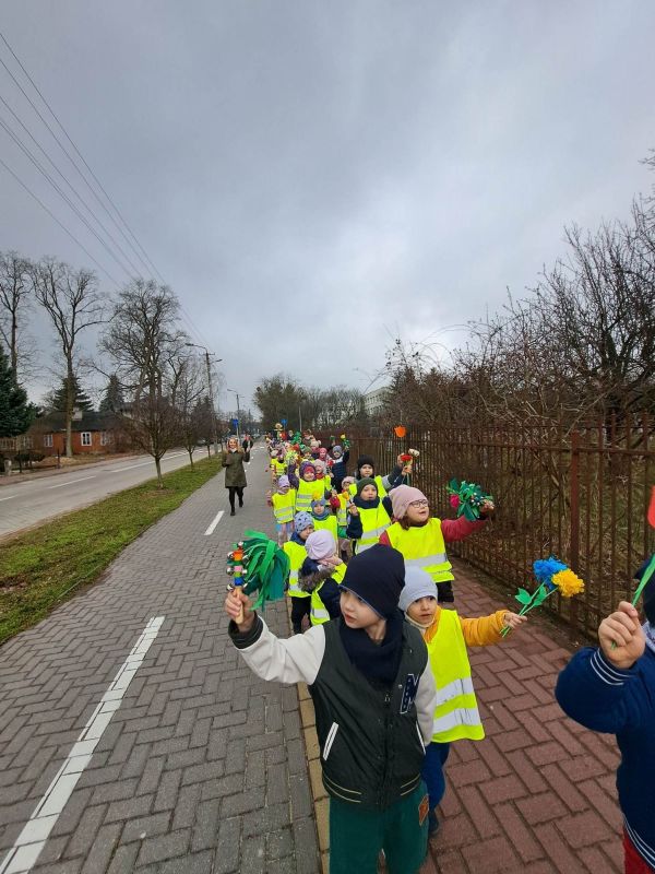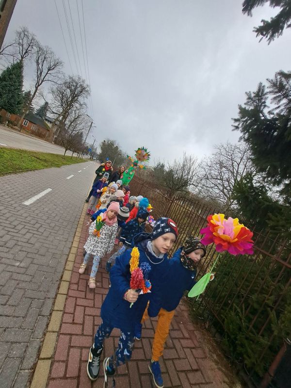 Następnie wokół budynku przedszkola ruszył barwny korowód z marzanną. Dzieci trzymały w rękach kolorowe kwiaty z bibuły i papierowe motylki. Śpiewały również wiosenne piosenki.