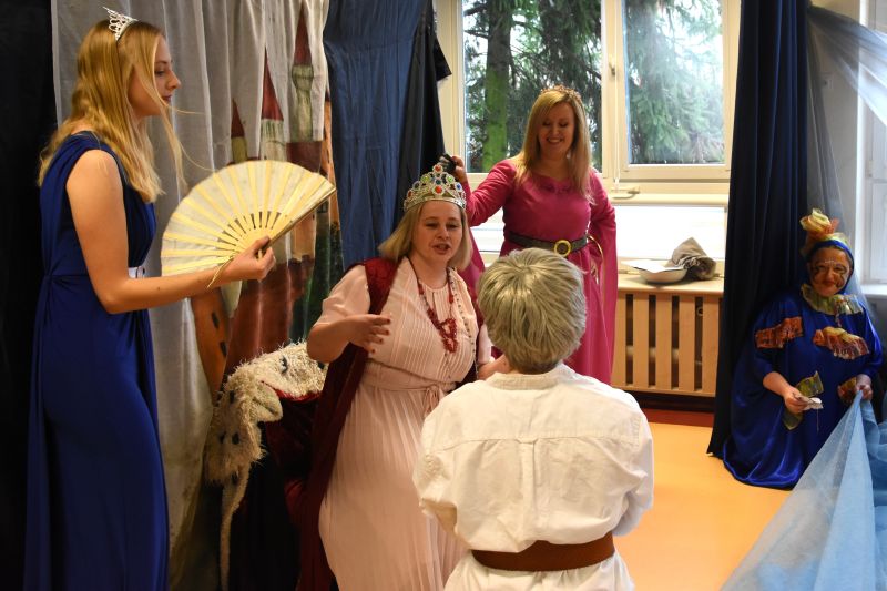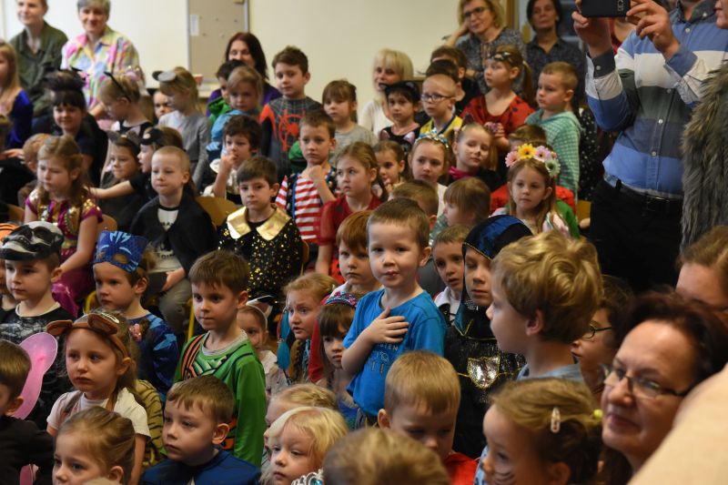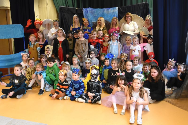 Przed rozpoczęciem zabawy nauczyciele i personel, którzy uczestniczą w Teatrze „Za Piątą Górą”, wyruszyli wspólnie z najmłodszymi w podróż do świata Złotej Rybki, spektaklu zrealizowanego na podstawie znanej baśni. Stroje do przedstawienia zostały przygotowane przez Marię Zwolak, a makijaże przez Anetę Kołodziej – Osek. Z losami bohaterów współgrała odpowiednio dobrana muzyka i piosenki śpiewane wspólnie z przedszkolakami. Po baśniowych przygodach dzieci, fantazyjnie poprzebierane, rozpoczęły karnawałową zabawę.
